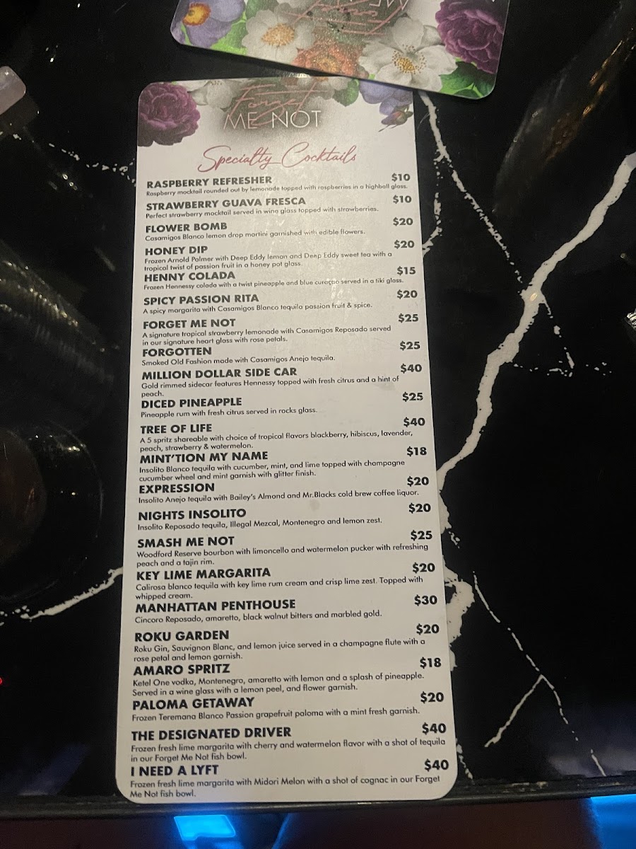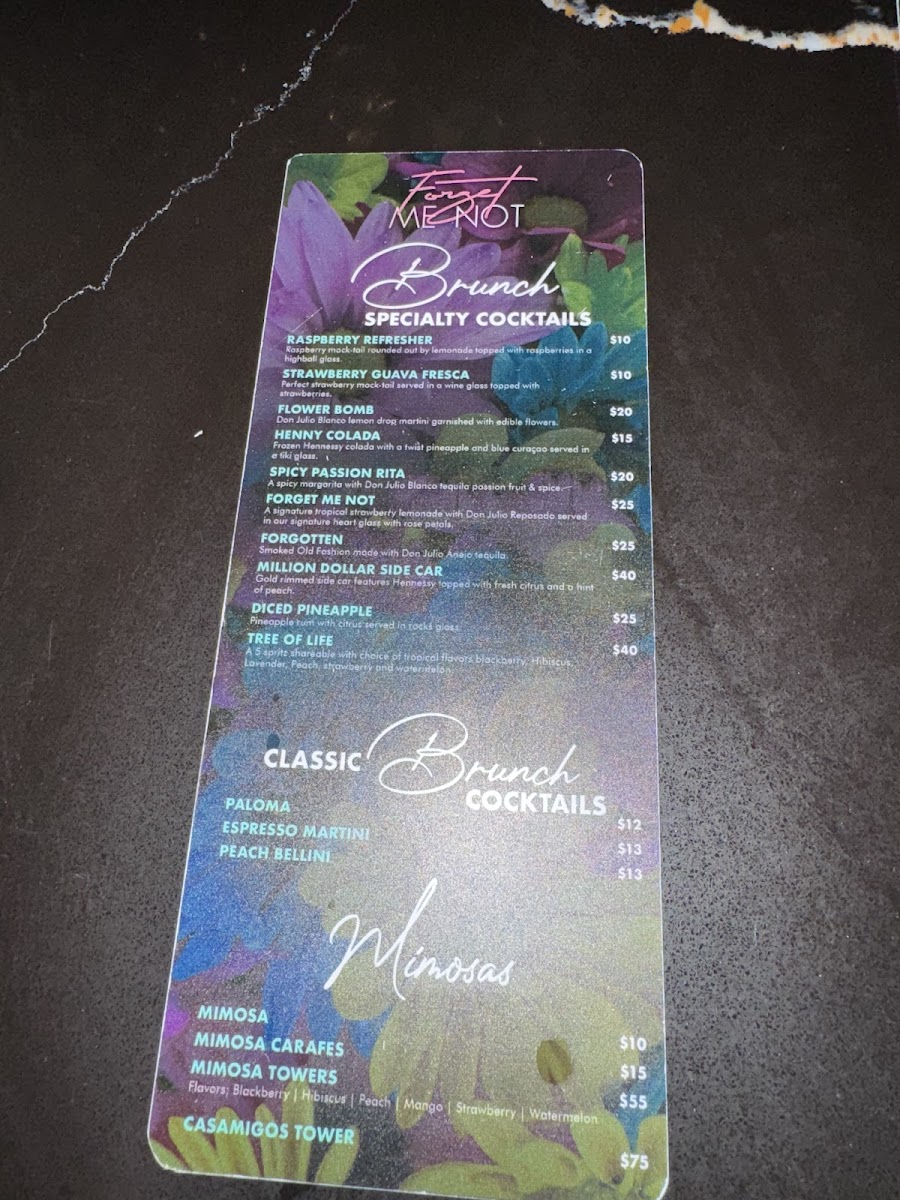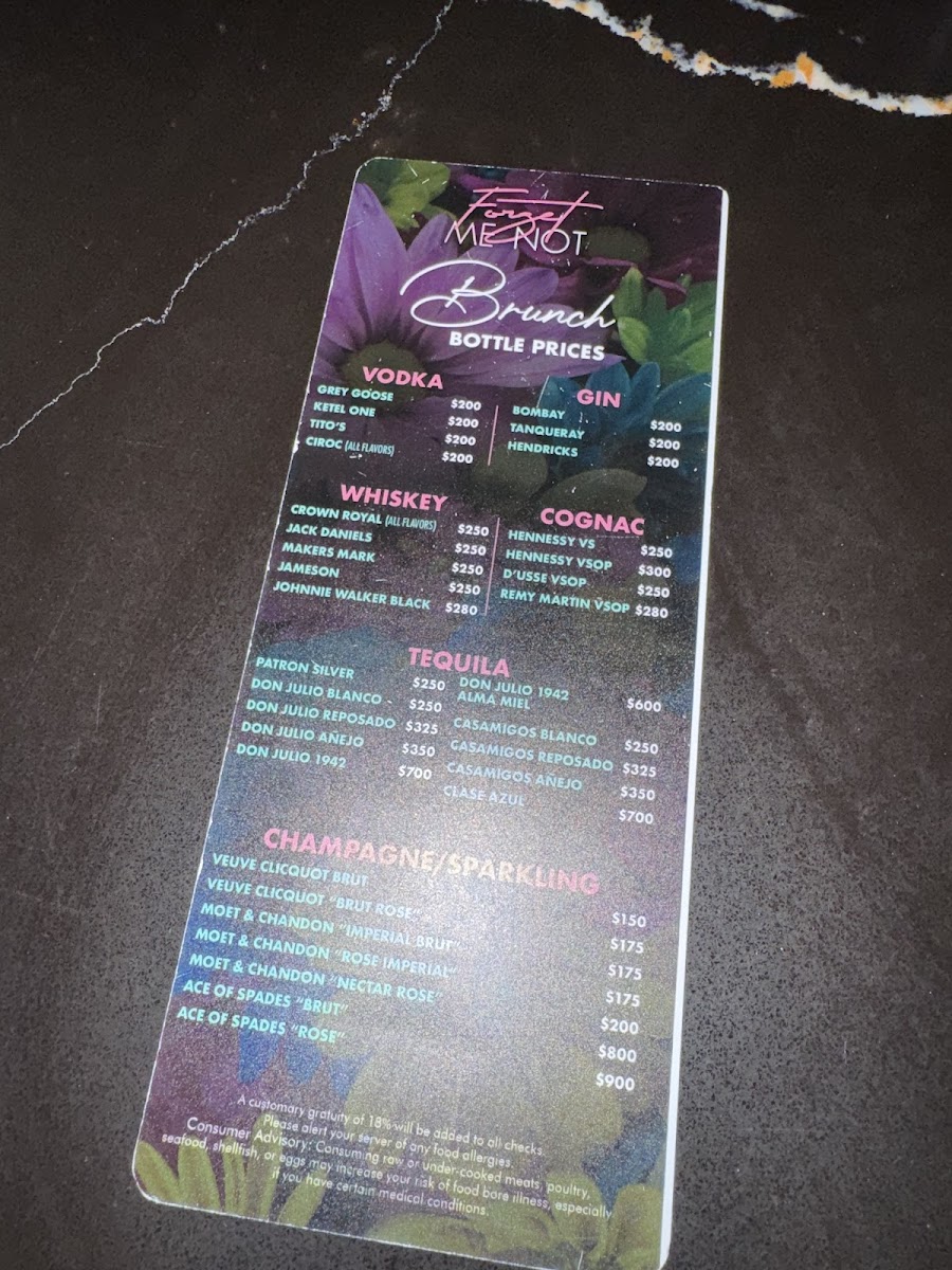 What truly sets Forget Me Not apart is its extensive drink selection. Sip on premium tequilas or a smooth cognac like the *Martin 1738*. The atmosphere buzzes with energy, making it an ideal spot for gatherings, celebrations, or a chic brunch. With rave reviews praising both the vibrant ambiance and attentive service, Forget Me Not ensures an unforgettable experience for all who visit.